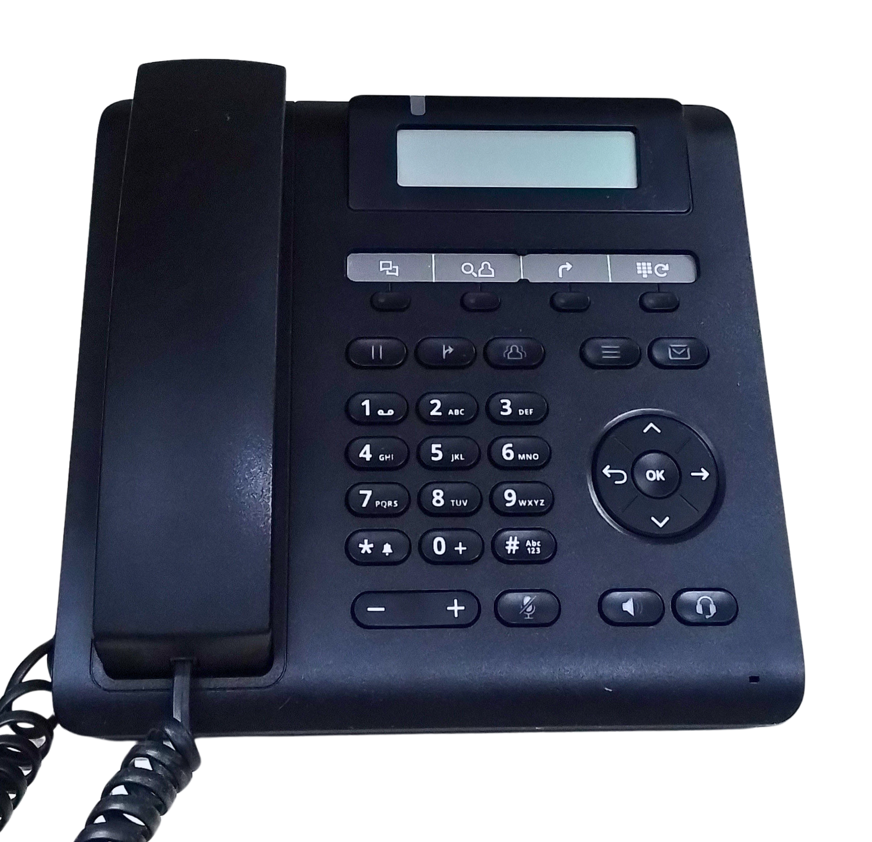 - 8 feste Funktionstasten, davon 3 mit LED (rot oder grün): Halten, Übergabe, Konferenz, Einstellungen, Nachrichten